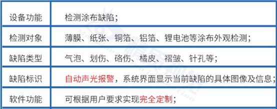 精質視覺涂布表面缺陷檢測系統是利用高亮LED光源將材料表面打亮,通過編碼器觸發高速相機實時采集圖像,檢測涂布表面是否存在如氣泡、劃傷、硌傷、橘皮、褶皺、針孔等缺陷,結合傳統圖像處理算法和AI人工智能算法,實現缺陷的精準識別、自動分類、數據存儲分析、ng位置貼標等功能,檢出率100%。