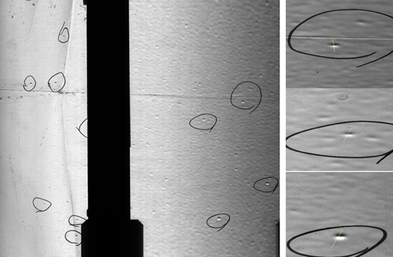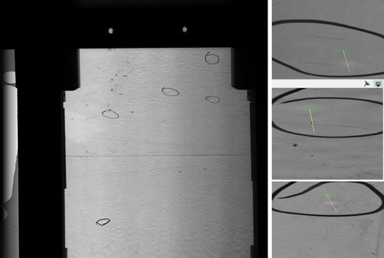 根據透射角度下對薄膜樣品的測試,一共圈出19個黑斑,上圖挑選9處具有代表性的成像效果圖供參考,綜上所述均可以檢出。