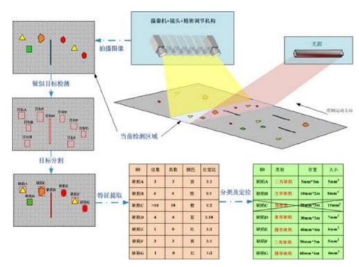 本臺設備安裝在銅箔分切機上,基本原理是將工業線陣 CCD 相機架設在材料上下表面兩側,采用高亮 LED 線性聚光冷光源將材料表面照亮,通過編碼器 觸發相機進行在線高速掃描式拍攝。高速圖像處理系統實時獲取銅箔表面壓坑、黑點、黑線、氧化斑、異物、劃傷、銅粉、銅粒、凹凸點、墊傷、污染、 褶皺、氧化、針孔等缺陷,系統通過數據庫來記錄和管理缺陷的橫縱向位置、 數量、大小和圖像等信息,可通過信號控制系統實時進行聲光報警、缺陷記錄、自動貼標等操作。通過軟件深度學習最終實現缺陷的分類。